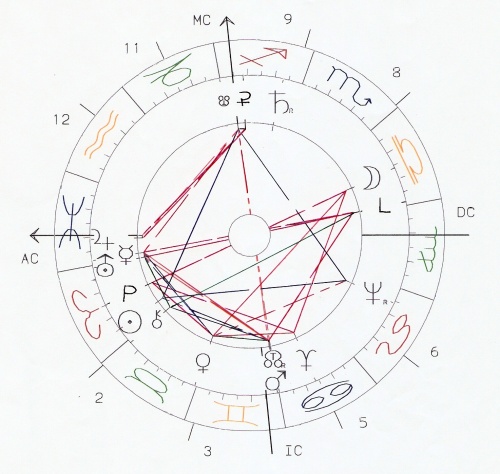 Bemerkenswert ist das Große Trigon zwischen Sonne, Neptun und MC (Saturn-Prinzip), das man vielleicht als Willen (Sonne) zum Verzicht (MC Trigon Neptun) interpretieren könnte, womit sich religiös gesehen eine selbstverständliche (Großes Trigon) Gelassenheit ergibt, die gut zu der vertrauensvollen Haltung des Jupiter in den Fischen paßt. Andererseits zeigt gerade die Verbindung der Fische- mit der Steinbock-Enerigie, daß der HE seine Religiösität nur in einem traditionellen Glaubenssystem leben wollte, das dogmatisch fest und beständig ist.